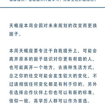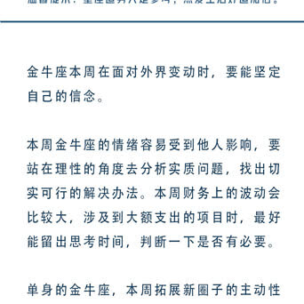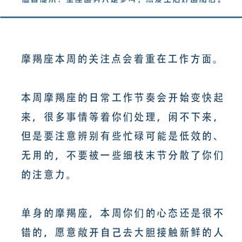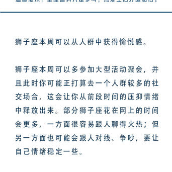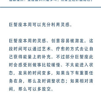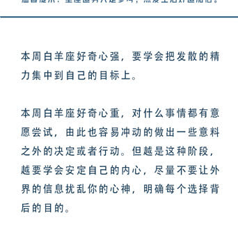十二星座一周运势🍑白桃星运 (07.15-07.21星座运势) 重点星象: (重点参考上升和太阳星座,一般运势是上升星座对应会发生的事件,太阳星座对应感受到的东西。) 7.15周一,火天合相。今天的你情绪不够稳定,容易走极端,尽量不要与人起冲突。 7.16周二,无重点星象。 7.17周三,无重点星象。 7.18周四,日天六合。今天的你会一改常态,展现出自己的态度,记得适度原则,避免锋芒过盛引来小人。 7.19周五,无重点星象。 7.20周六,火海六合。今天的你可以适当休息,把精力消耗在想做的事情上也是一种幸福。 7.21周日,火星进入双子座,摩羯座满月。你的精力旺盛却很难专注,可以多给自己安排一些琐事,一些关系或工作也许需要被断舍离,将所有的负能量留在今天,明天又将充满希望。 ![]() ![]() ![]() ![]() ![]() ![]() ![]() ![]() ![]() ![]() ![]()